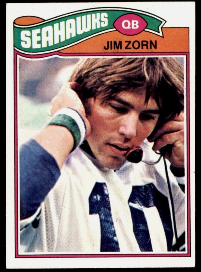 And because I was six years old when Zorn was cut by the Cowboys and ended up on Seattle football cards, the first of which was that 1977 Topps, you’ll forgive me if there was a time when I conflated that transaction with the one not much later in which Dallas sent a late first-round pick, two seconds, and receiver Duke Ferguson to the Seahawks for the second pick in the 1977 draft, which the Cowboys used to take Tony Dorsett.