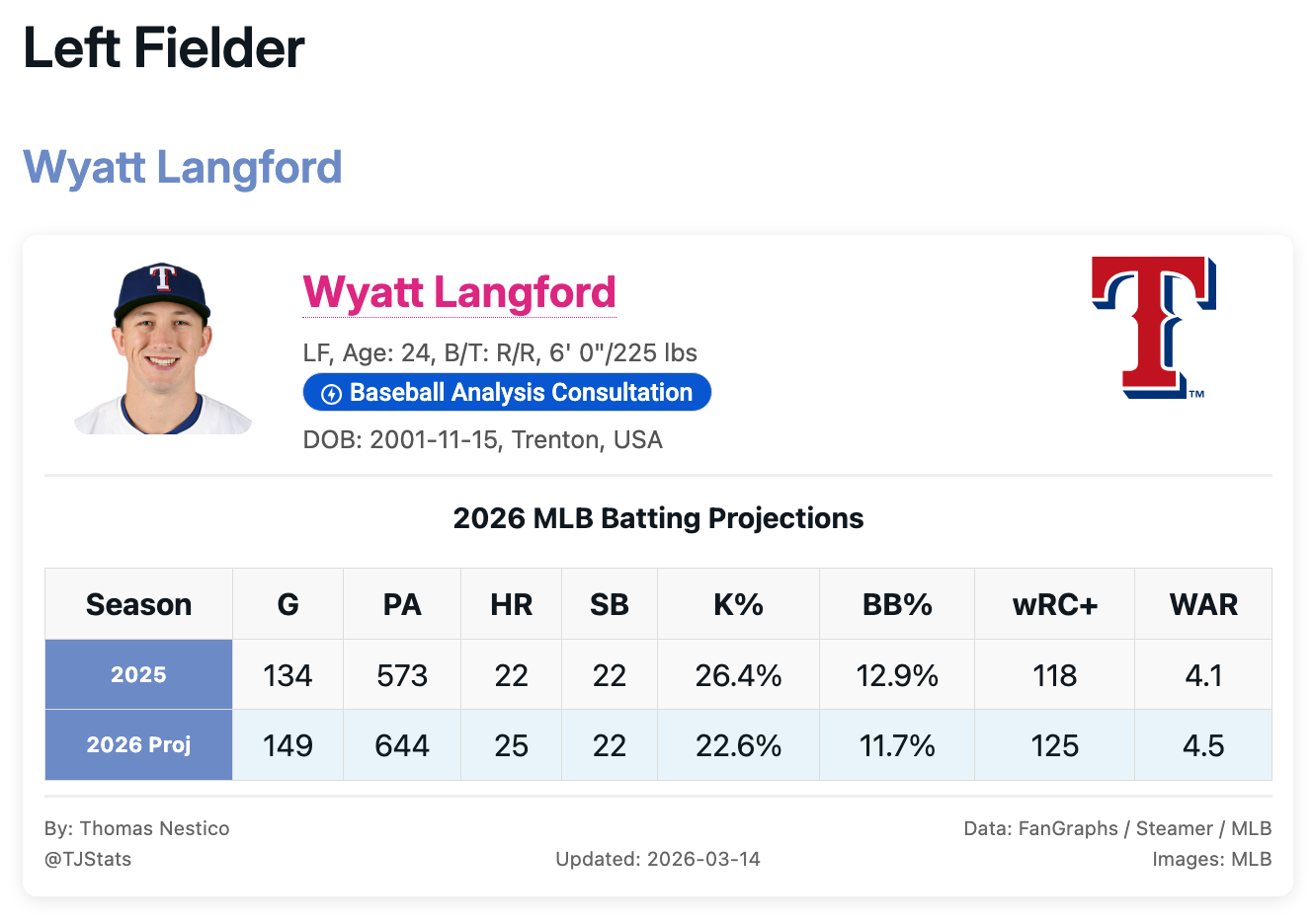 In a story featuring a hitter at each position whom he expects to exceed expectations in 2026, Thomas Nestico includes Langford as his left fielder.