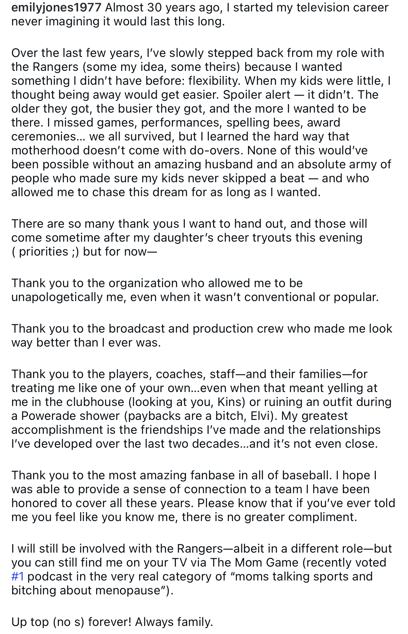 I could spend some time in this space running down what Emily Jones has accomplished in her long and impactful career as part of the Rangers TV broadcast, but for me this doesn’t call for the way you’d introduce a keynote speaker.